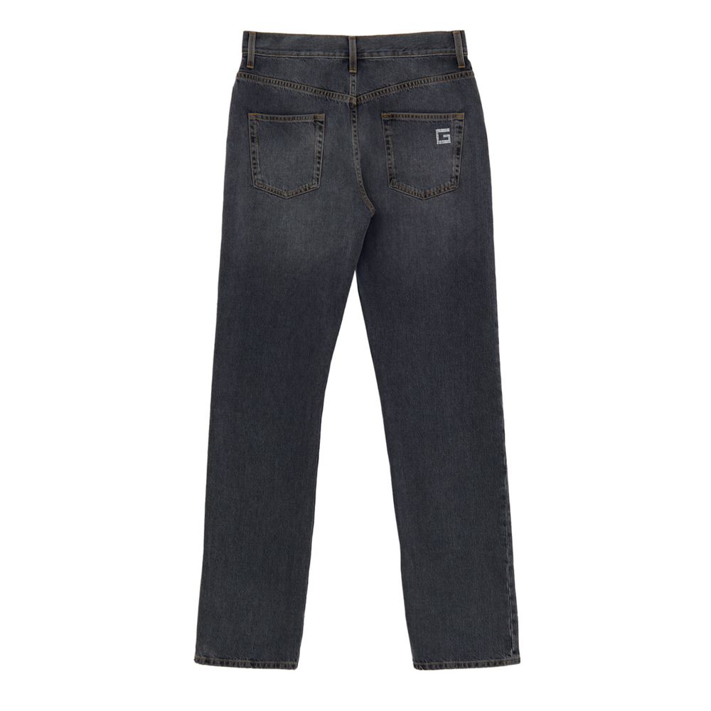 In dark gray washed denim, button opening, five pockets, regular fit. On the back pocket Gucci logo in crystals