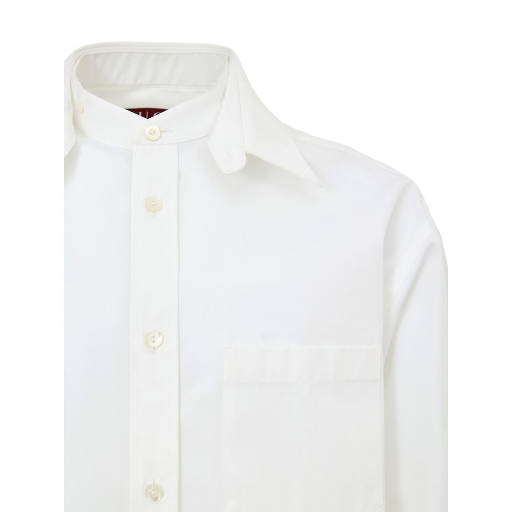 Front button fastening, removable classic shirt collar, mandarin collar. Double cuff. Patch pocket on the side, rounded at the bottom.